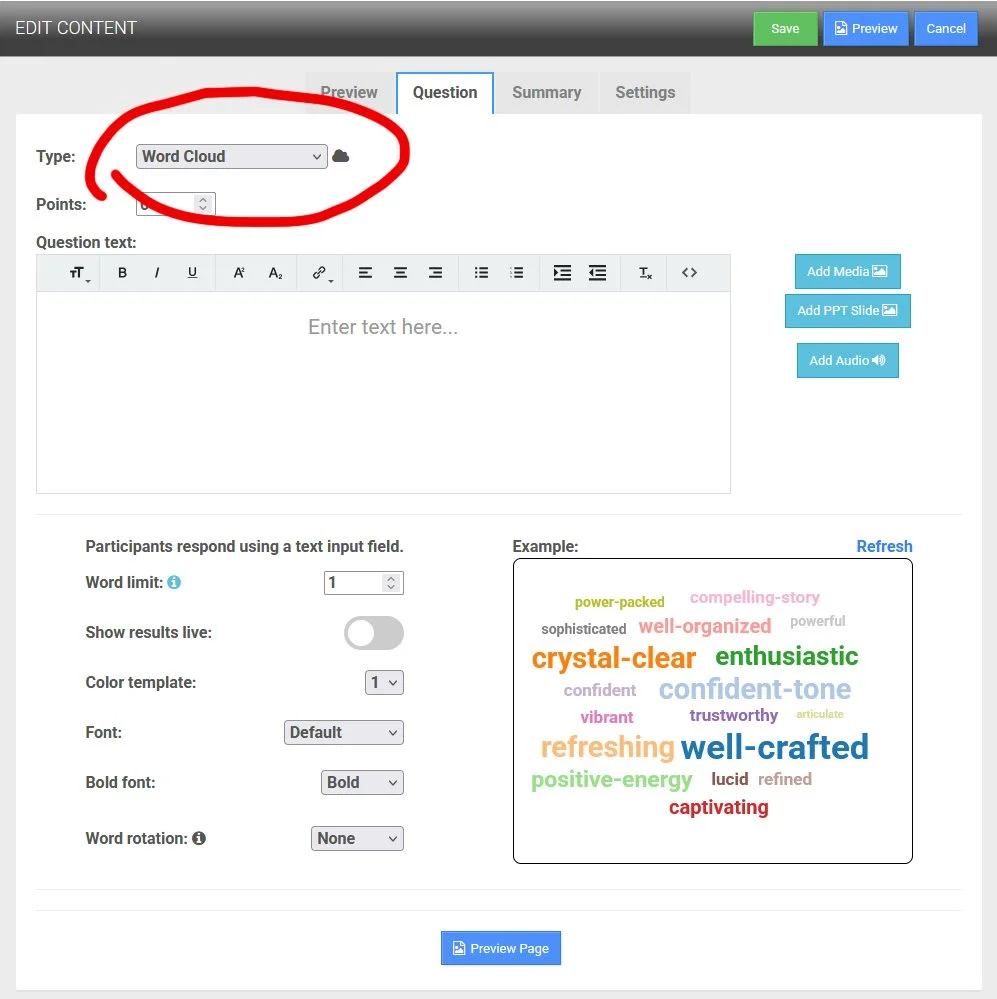 Click the Question tab and select Word Cloud as your question type option from the drop-down menu.